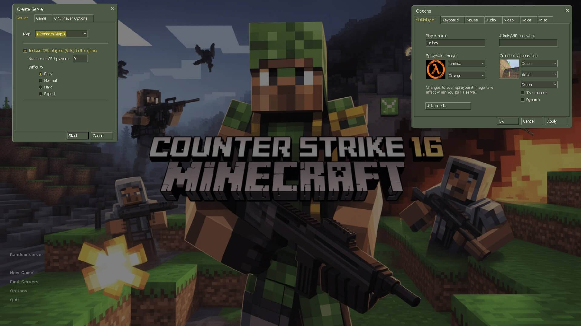 Fire up the game, and the main menu hits you like a nostalgia bomb. Counter strike minecraft shines here with a background featuring classic CS characters - GIGN, Phoenix Conn, the whole crew - but rendered in glorious Minecraft block style. Square jaws, pixel armor, standing amid floating islands and lava flows.